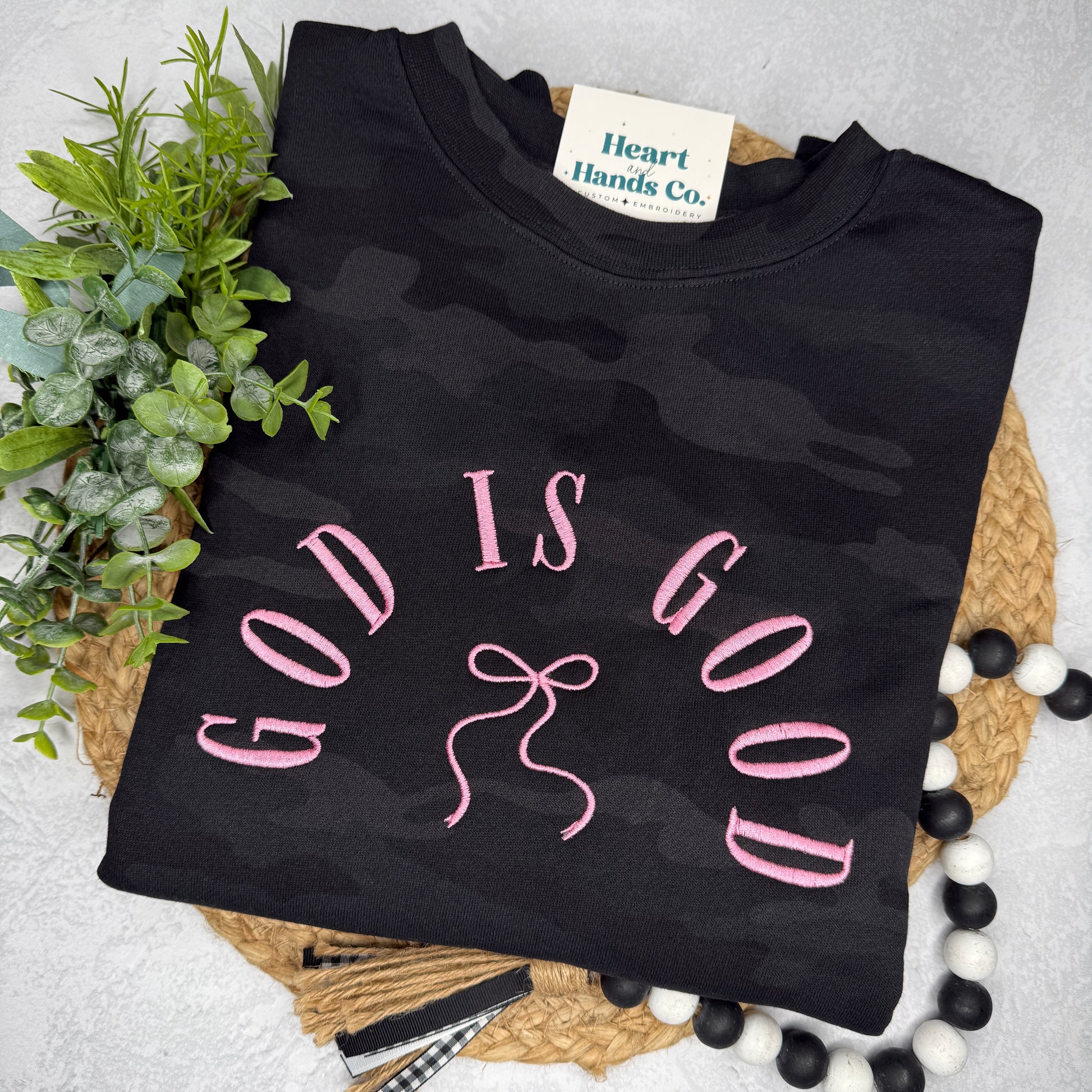 Faith meets fashion in our God Is Good embroidered sweatshirt. Featuring bold pink stitching on a subtle black camo background, this cozy piece is the perfect way to share your faith while staying stylish and comfortable.